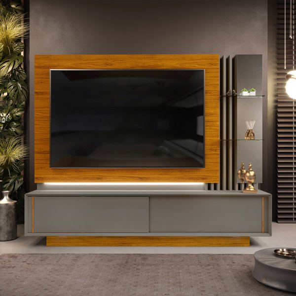 Puerta corrediza y panel con detalles ripadosEstante superior de 25MMEspacio para dispositivos electrónicos y parlantesParte superior de 37 mm de espesorSoporta televisores de hasta 70″ Peso77.4 kg Dimensiones1.83 largo× 1.95 alto × 0.39 m prof